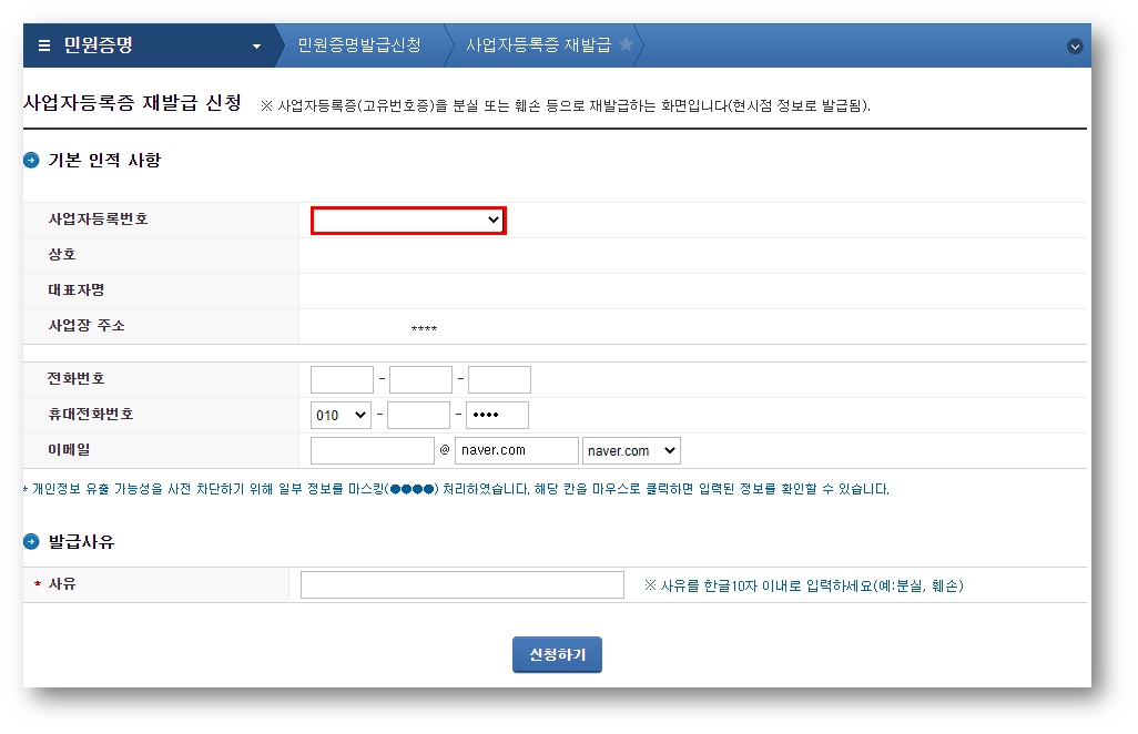 - 발급사유 : 필수 기재항목으로 주로 분실, 훼손 등으로 기입합니다.