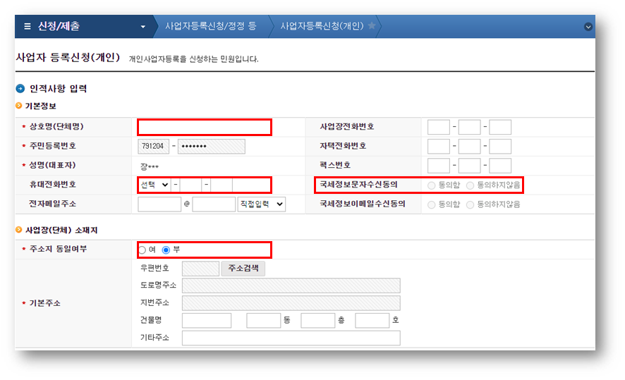 3. 사업자 등록신청(개인) 》 인적사항 입력