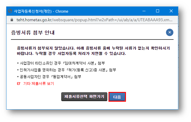 첨부한 서류가 없기 때문에 증빙서류 누락에 대한 안내창이 나타납니다. 저는 서류제출이 필요 없으므로 [다음]을 클릭합니다.