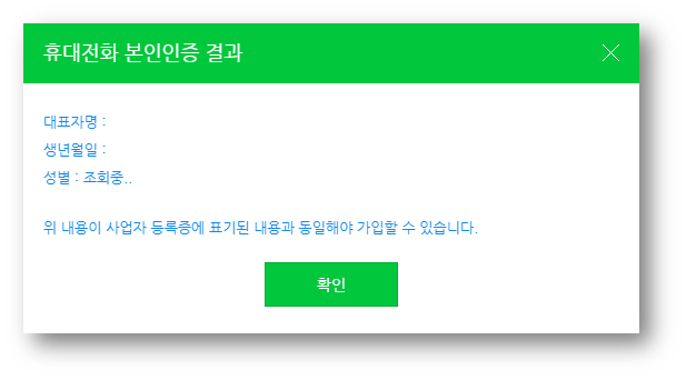 휴대전화 본인인증 결과가 나타납니다. 사업자등록증에 표기된 내용과 동일해야 합니다.