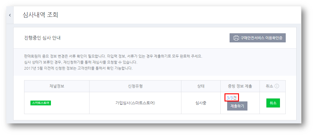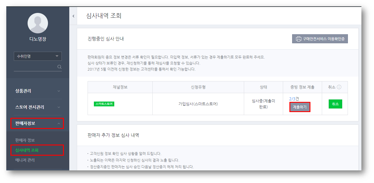 판매자 정보 > 심사내역 조회를 보시면 최종적으로 승인된 내역을 확인할 수 있습니다.