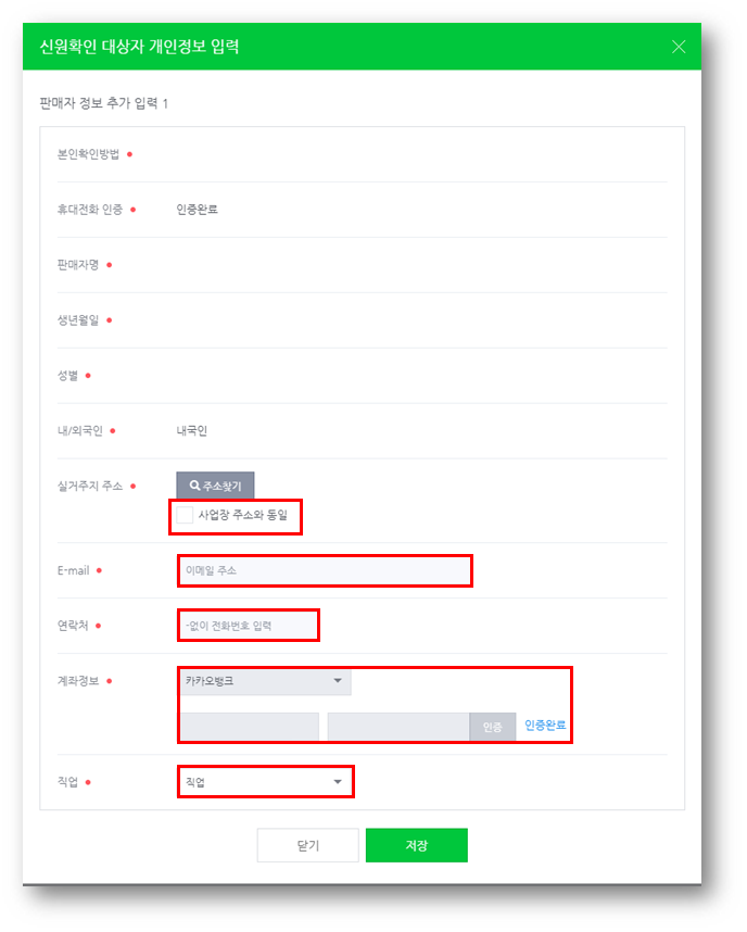 - 정산대금 입금계좌 : 사업자등록증에 있는 대표자의 통장으로 휴대전화로 인증한 판매자명과 동일한 이름으로 개설된 계좌여야 합니다.